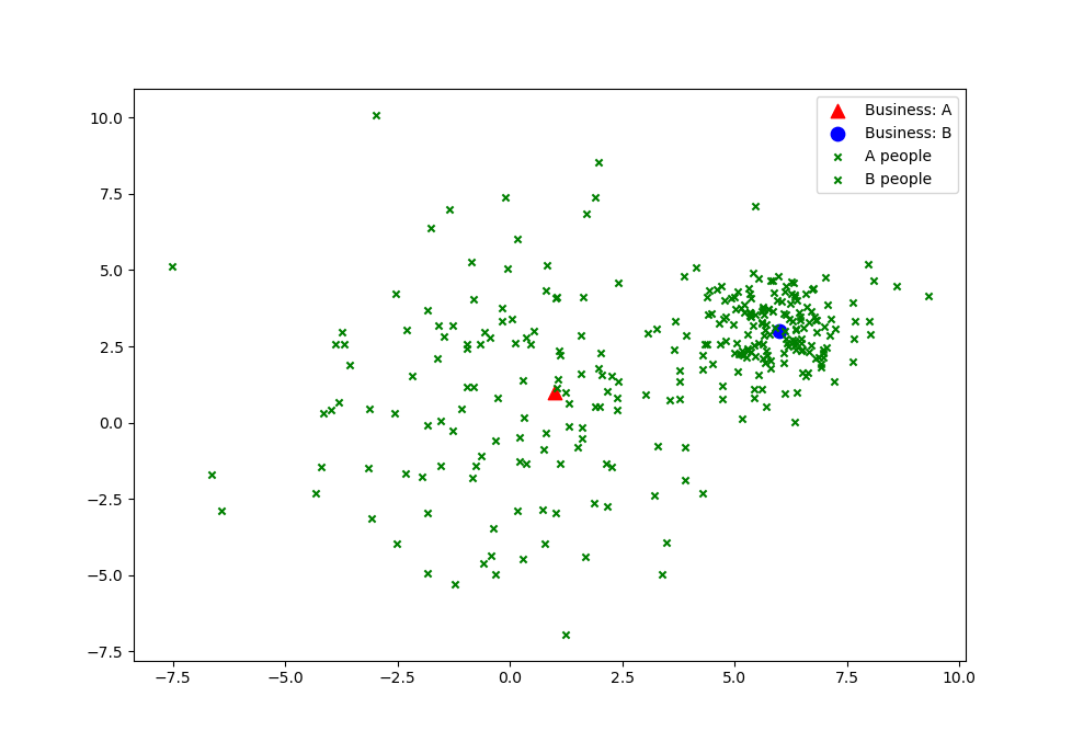 Example: point p is 5 ft from \(k_i\) and 10 feet from \(k_j\). K-means would then place point p into the \(k_i\) group. Once, all the points are placed into a cluster or group, the new means for each cluster (\(k_i\) and \(k_j\)) are updated. The location for each mean cluster k is calculated by finding the mean from all the points that belong to that cluster.